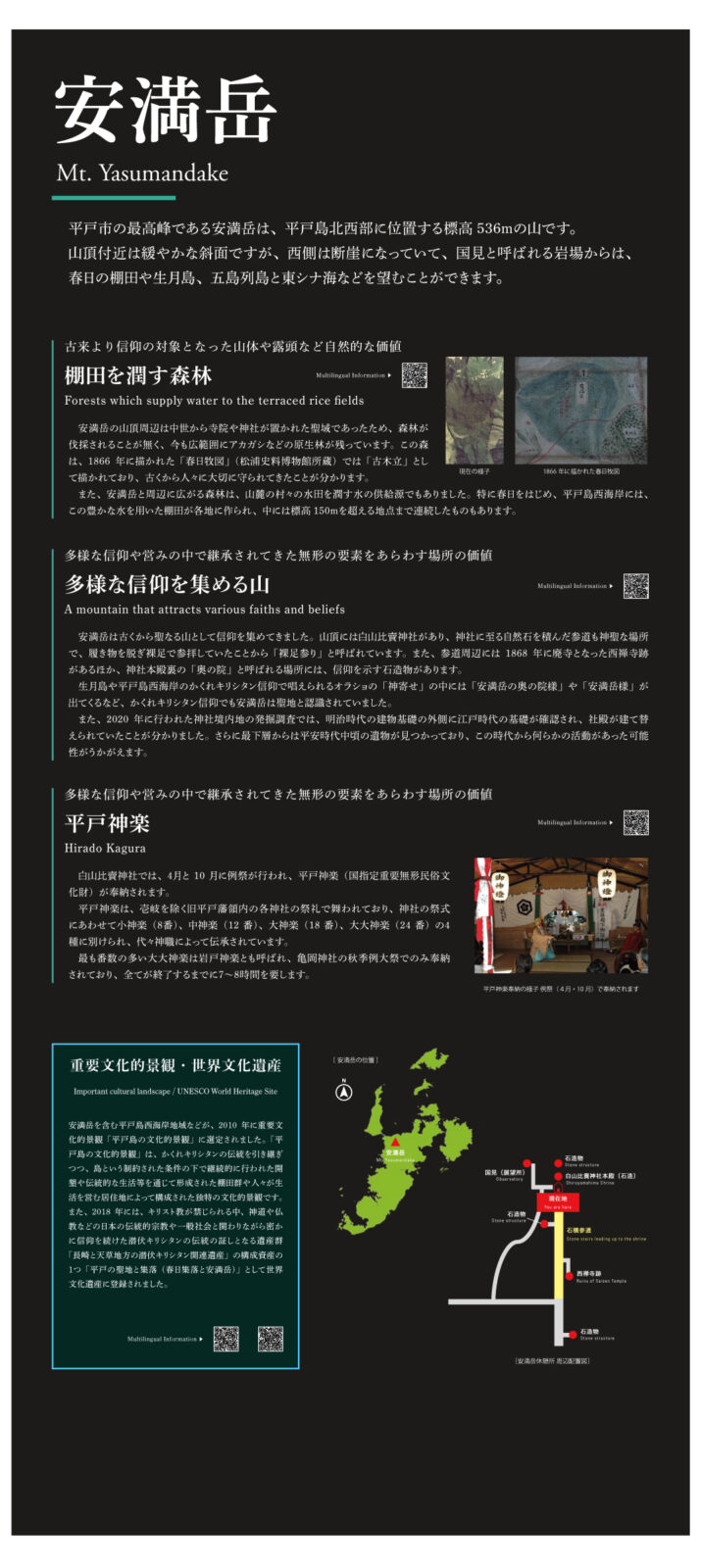 また、文化財や世界遺産の案内などでは、外国語にも対応できるよう、わかりやすさと品格を両立したサインづくりを目指しています。